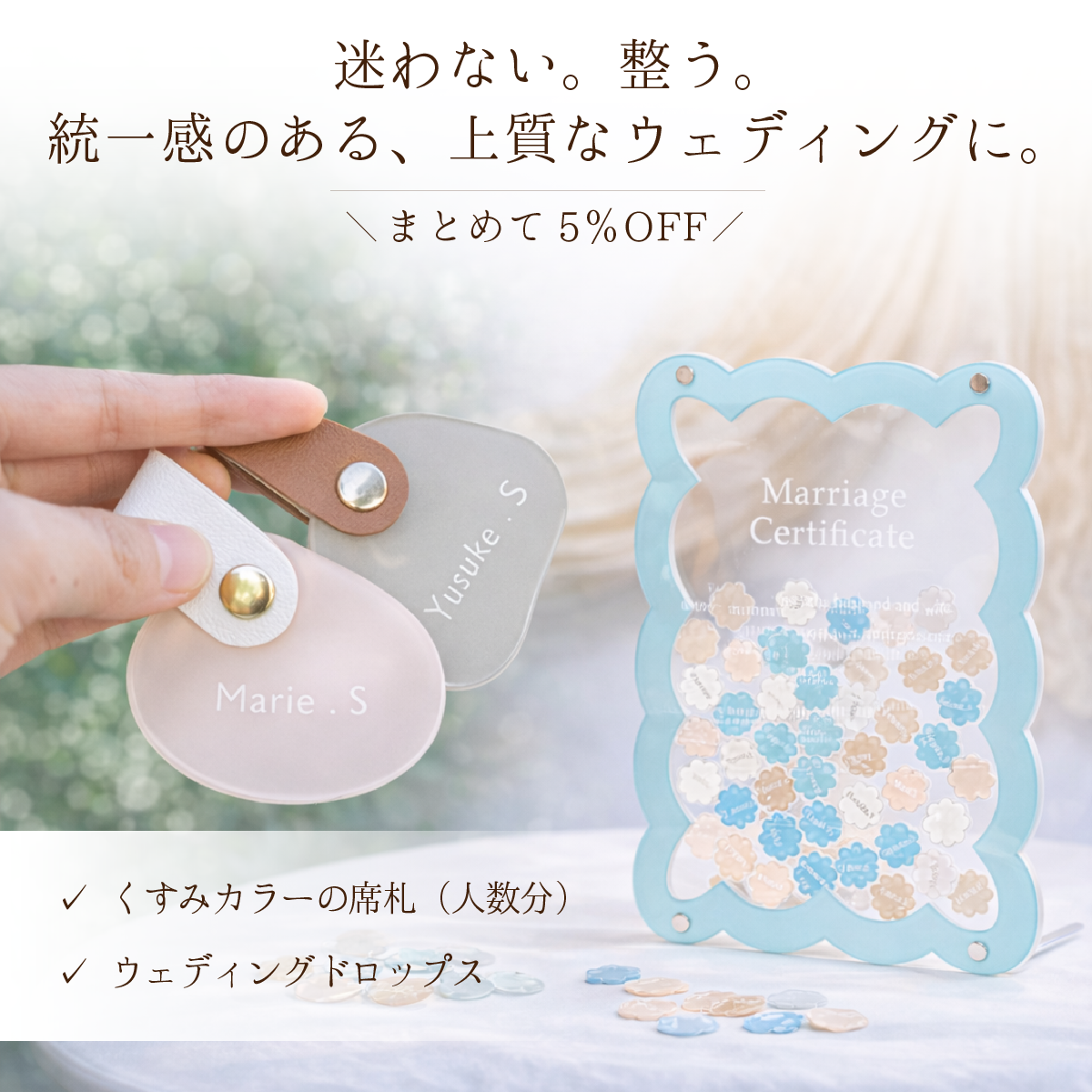 くすみカラーの席札と、ゲスト参加型の結婚証明書。